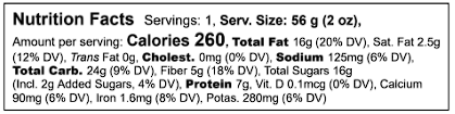 Serving Size: 1 Cookie (28g). Calories 270, Total Fat 18g, Sat. Fat 2.5g, Trans Fat 0g, Cholest. 0mg, Sodium 130mg, Total Carb. 24g, Fiber 5g, Total Sugars 17g (Incl. 2g Added Sugars), Protein 7g, Vit. D 0.1mcg, Calcium 90mg, Iron 1.4mg, Potas. 290mg.